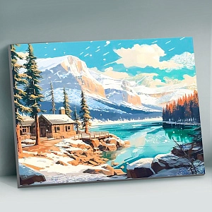 Картина по номерам 40х50 "Домик у горного озера" с поталью платина (26 цветов)   Копировать Скопировано