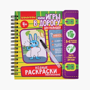 8 сюжетов для раскрашивания и 8 карт с вопросами к ним, кисть со встроенной емкостью для воды.