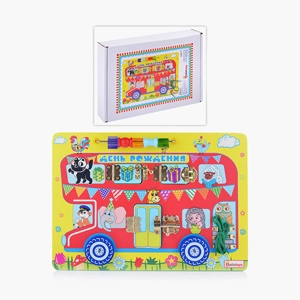 • Игрушка представляет собой развивающую доску с деталями разного функционала: шнуровка, замочки, шестеренки.