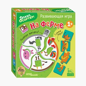 - Деревянный пазл «Ферма» — крупные элементы с изображениями животных для малышей от 1 года.