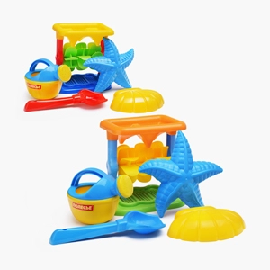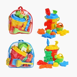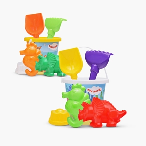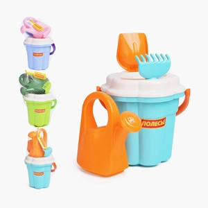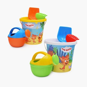В наборе: автомобиль-самосвал "Муравей" (29х16х16 см.); лейка малая (14.5х11.5х11.5 см.); ведро малое (12х11.5х10 см.); 6 формочек: машинка, паровозик, белка, собачка, котёнок, медведь (14х10.5х2 см.); лопатка (22 см.); грабельки (19 см.).