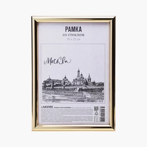 Рамка пластиковая 15x21 см, формат A5, серия 1 (багет 14 x 14 мм) стекло, задняя панель - переплетный картон, с подставкой для установки на столе, золотая, в термоусадочной пленке